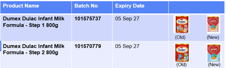 Singapore Food Agency (SFA) has issued a recall for the following products: